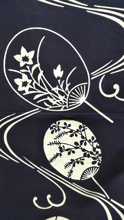 コーマ地に紺色で染められ、流水と団扇の柄が白抜きでキリッと爽やかです。