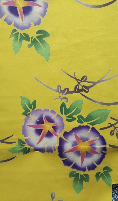 明るい黄色に朝顔の柄がとても可愛らしい一枚です。