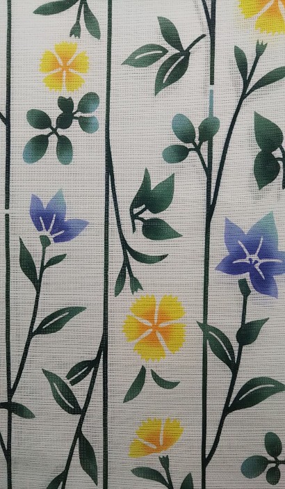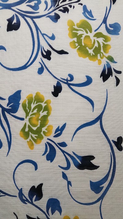 白地に縦に花の柄がスキッとしてます。花の青、黄色がポイントになってます。