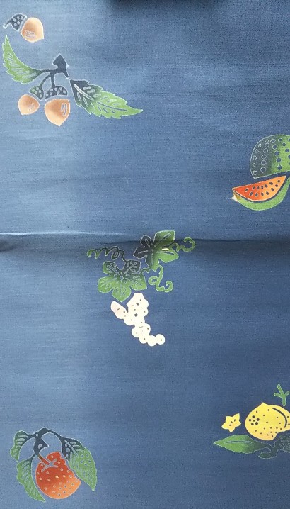 青のほんのりグラデーションに、スイカ、桃、ぶどう等々の果物の柄がカワイイ一枚です。