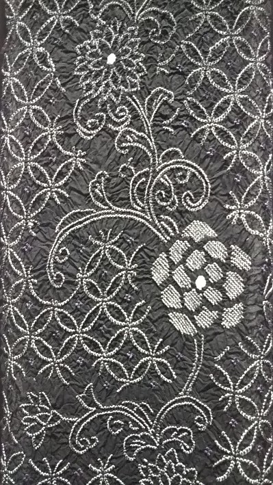 黒地に七宝、花唐草の柄が絞りで作られています。